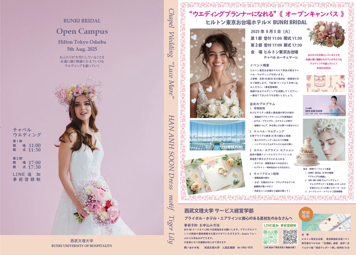 8月5日(火)に、ヒルトン東京お台場のチャペルにて、BUNRIブライダル「恋人ウエディング」を2部制で実施いたします。このイベントに、西武文理大学に興味のある高校生とそのご家族 各回 40組 80名様をご招待いたします!