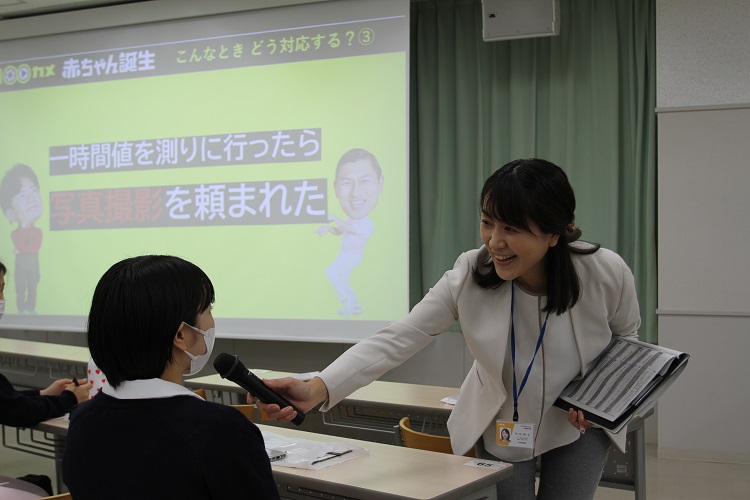 番組に出演された本学実習病院である愛和病院助産師の新井郁子さん、そして番組を制作した小林涼太ディレクターが講師となり、仕事のやりがいや撮影秘話を語ってくださいました。