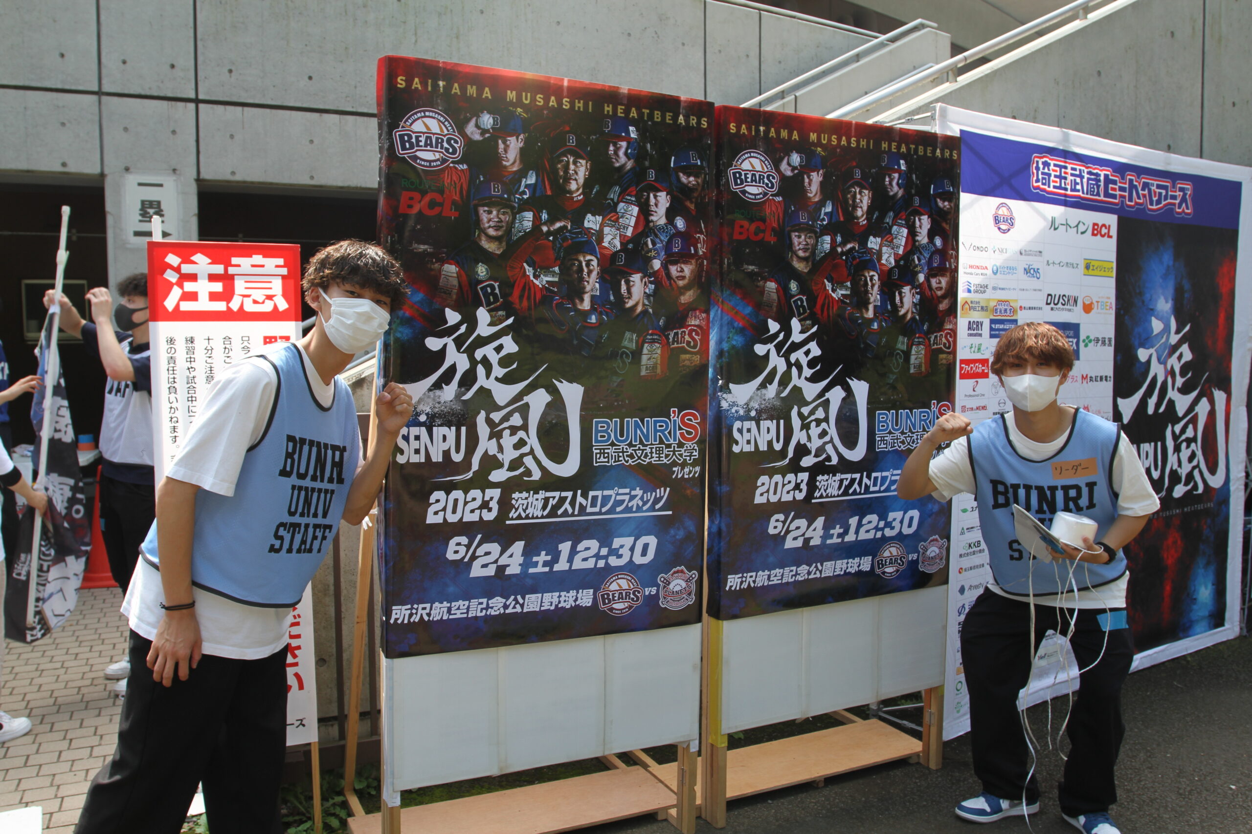 サービス経営学部の体験・実習科目「サービス・ラーニング(スポーツマネジメント)」(1年次配当科目)の一環として、西武文理大学の学生約50名が、プロ野球独立リーグに所属するプロ野球球団「埼玉武蔵ヒートベアーズ」の試合の運営に携わりました。