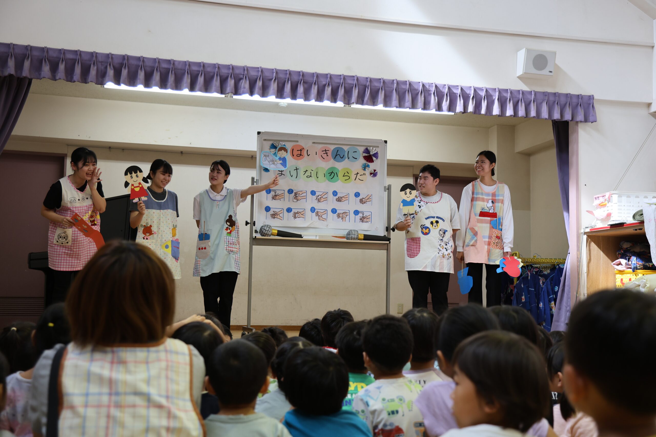 2024年10月1日(火)に取材したのは、小児看護学領域の「総合実習」。この日は、3つある実習施設のうちの一つ、所沢市にある「みどり保育園」で、2歳から5歳の園児たちに向けて健康教育を行う、本番の日であった。10名の学生は、5人ずつの2チームに分かれて健康教育のテーマを考え、実際にどのように園児たちに伝えるのかを、検討し準備を進めてきた。