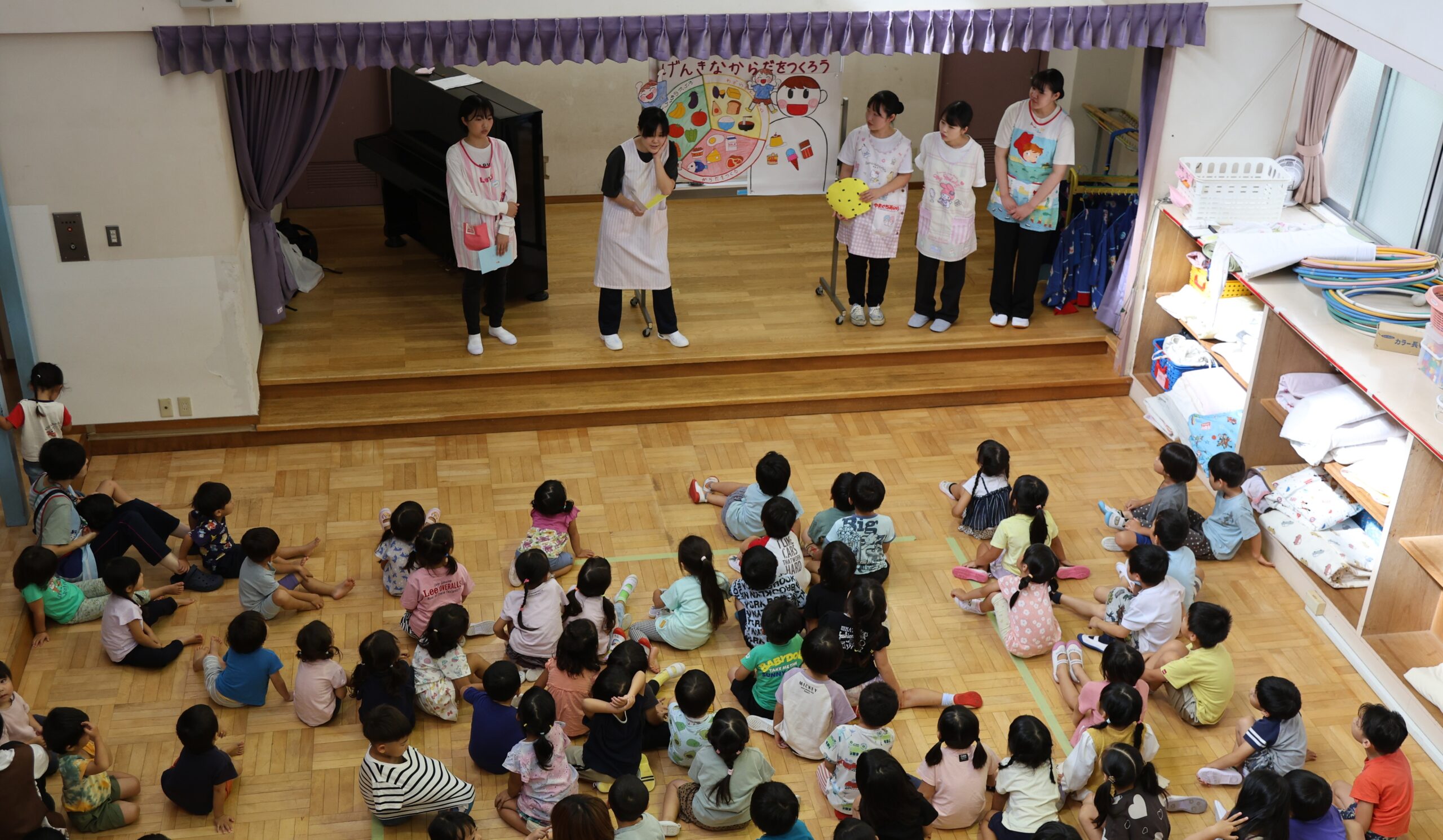 最後に、学生全員がステージに上がると、園長先生の号令の下、園児たちの「ありがとうございました」という元気な声と大きな拍手がホールに響いた。