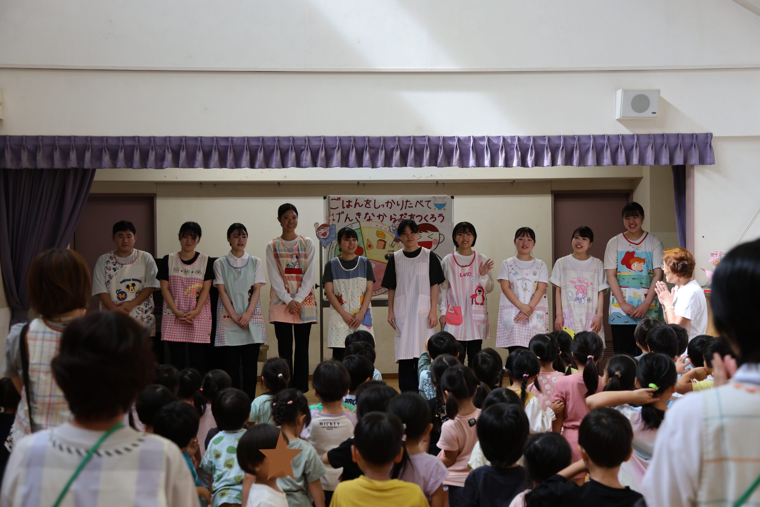 前述の、学内で準備を頑張っていた学生たちの出番である。見どころは、甘いものばかり食べて具合が悪そうな登場人物の顔が、バランス良くたべることで、元気な顔に変わる演出である。園児からは「かおがかわった~!」と元気な反応が返ってきた。園児を飽きさせずに、興味を持ってもらう工夫で、最後まで内容を伝えきった。